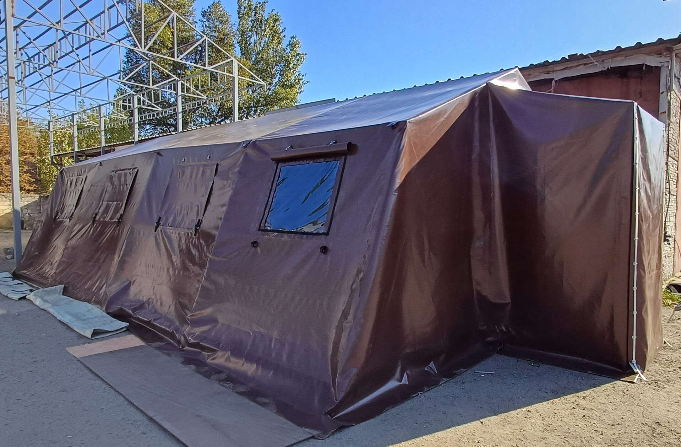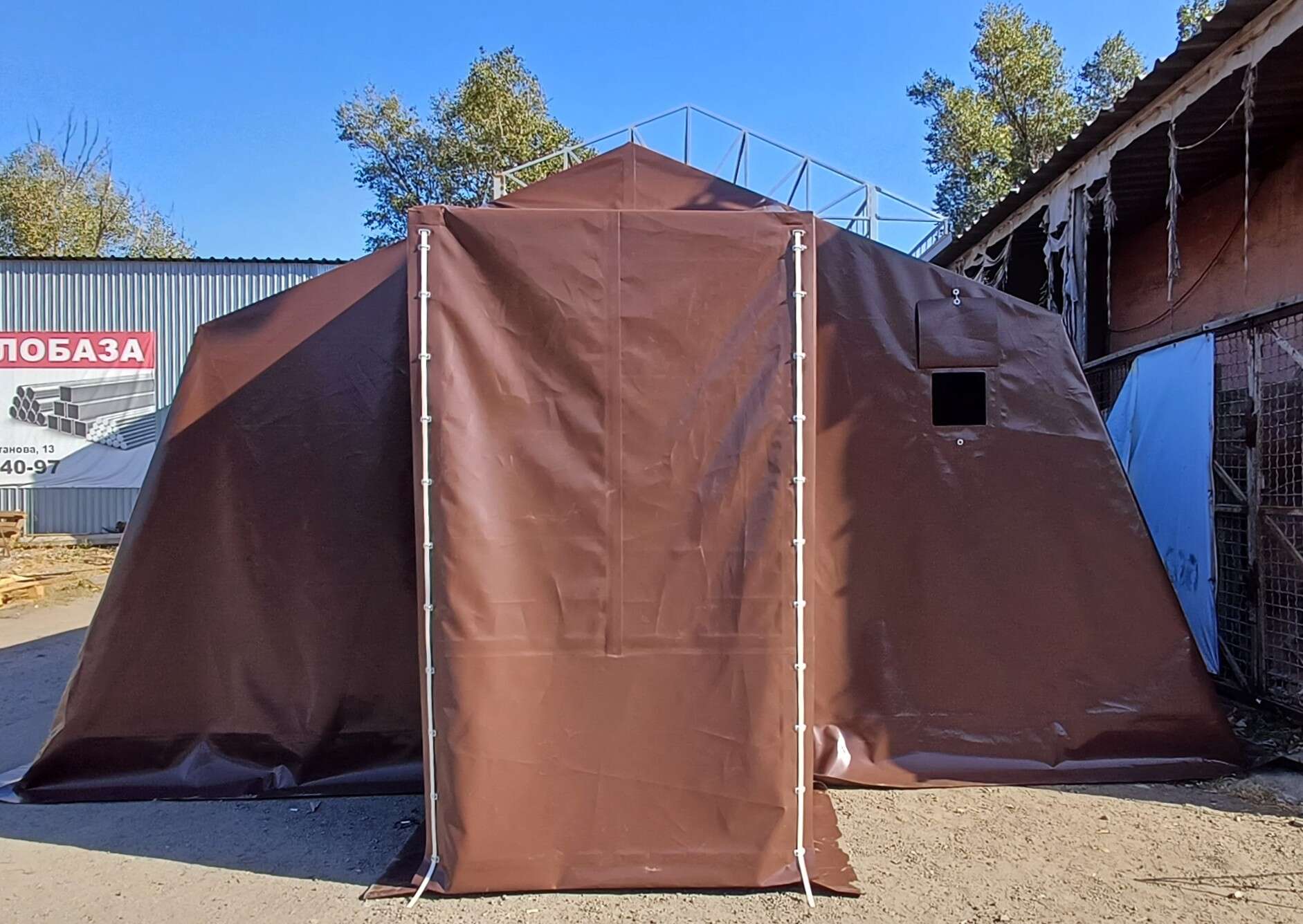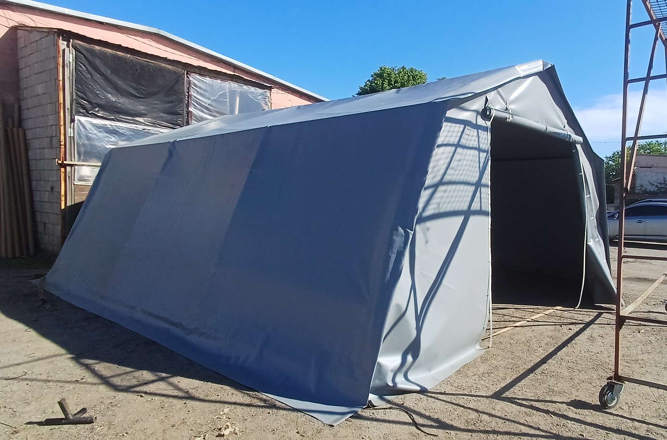 Палатка предназначена для использования как в полевых условиях для военных, медиков, строителей, так и как дополнительное помещение для мастерской, склада, гаража и других целей. Относительно легкий каркас обеспечивает возможность быстрого монтажа/демонтажа палатки, что позволяет использовать палатку как мобильное помещение. Крыша и стены изготовлены из ПВХ ткани плотностью 650 гр/м2. Для этих тканей тканей характерна высокая механическая прочность, длительная эксплуатация изделий, а также устойчивость к выгоранию и загрязнениям. Они могут эксплуатироваться при диапазоне колебаний температур от -40 до +70 градусов Цельсия. Тентовые ткани обладают рядом характеристик, благодаря которым обладают высокой долговечностью. Текстиль изготовлен из 100% полиэстера высокой прочности, покрыт высококачественным ПВХ с обеих сторон, а также защитным слоем лака. Это обеспечивает защиту от влаги, стойкость к ветровым нагрузкам, выгоранию, перепадам температуры. Срок службы тента из ПВХ ткани более 5-7 лет при активной эксплуатации.
